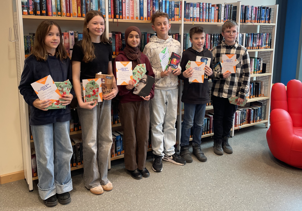 Alle klassenbesten Vorleser*innen wurden mit einer Urkunde und einem Büchergutschein für die örtliche Buchhandlung „Lesezeichen“ ausgezeichnet. Unser Schulsieger Henry erhielt eine extra Urkunde und einen weiteren Büchergutschein. Alle Gutscheine sponserte der Förderverein des Gymnasiums.
