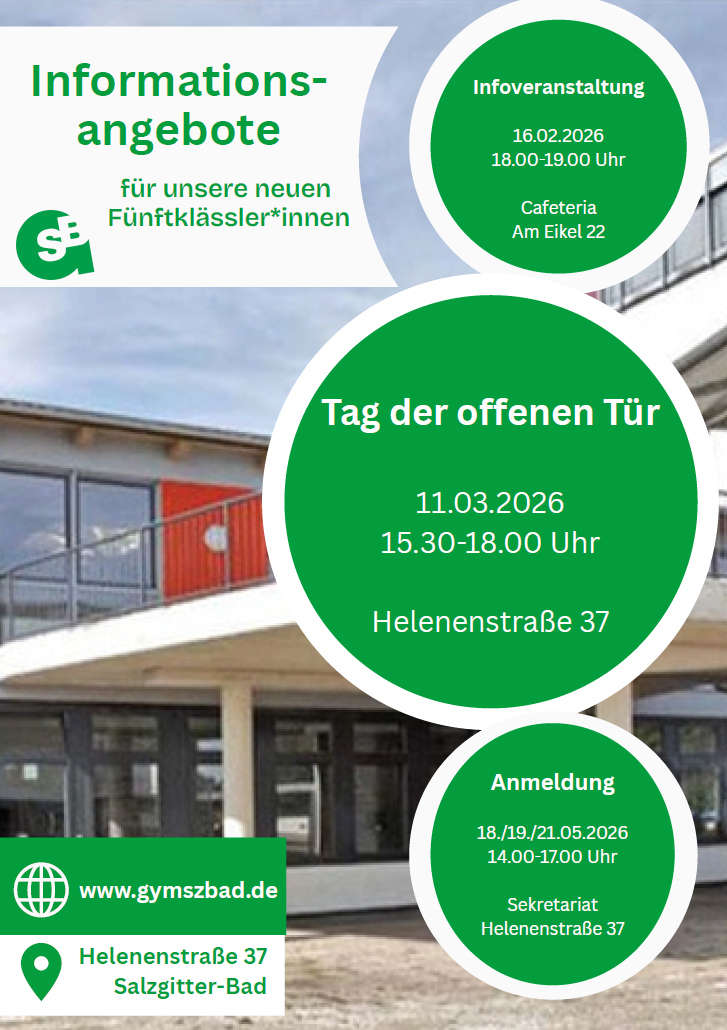 Die Anmeldung findet am Montag, dem 18.5.26, am Dienstag, dem 19.5.26, und am Donnerstag, dem 21.5.26, jeweils in der Zeit von 14:00 Uhr bis 17:00 Uhr im Sekretariat in der Eingangsstufe, Helenenstraße 37, 38259 Salzgitter statt.