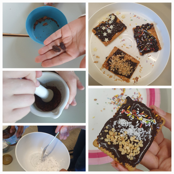 Am vorletzten Schultag griffen wir das Thema der Verarbeitung von Kakao in der Schule nochmals auf. Kakaobohnen wurden in mühevoller Arbeit zerkleinert und dann mit anderen Zutaten vermischt, sodass am Ende tatsächlich Schokolade entstanden war. Alle waren sich einig – das war sehr lecker!