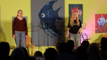 Der Fachbereich Darstellendes Spiel sorgte ebenfalls für besondere Momente: Alina Nichotz und Julie Kaiser (beide WPU DS, Jahrgang 9) präsentierten eine nachdenkliche Performance zum Thema „Das Leben und ich“. Jana Becker, Finja Roß und Lara Jordan (alle Jahrgang 11) inszenierten eine Talkshow-Szene zum Roman „Corpus Delicti“ von Juli Zeh und gestalteten ein emotionales Kreuzverhör, das das Publikum in seinen Bann zog.