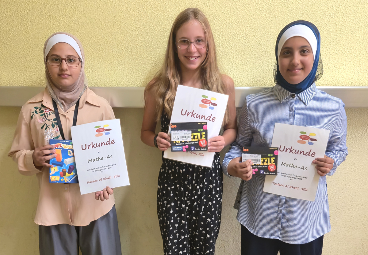 Im letzten Schuljahr stellten sich zahlreiche Schüler*innen der Jahrgänge 5 und 6 den kniffligen Mathe-Knobelaufgaben. Dabei glänzten überraschend viele, nämlich fünf Mathe-Talente mit den meisten richtigen Lösungen! Diese herausragenden Köpfe wurden feierlich als "Mathe-As des Jahres" ausgezeichnet und erhielten dafür einen verdienten Preis sowie eine Urkunde.