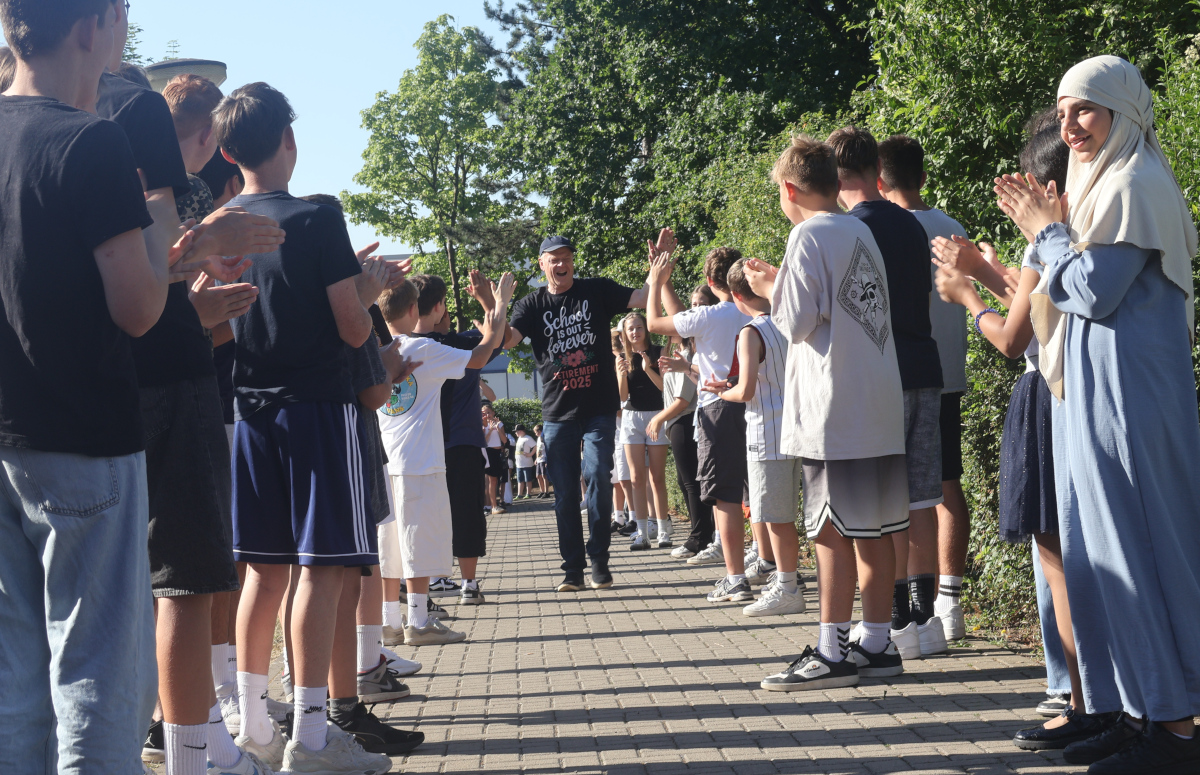 Am Mittwoch bildeten alle Schülerinnen und Schüler ein Spalier für ihren Schulleiter und schickten ihn noch einmal mit großem Applaus auf den Weg vom Hauptgebäude in die Eingangsstufe „Helene“.
